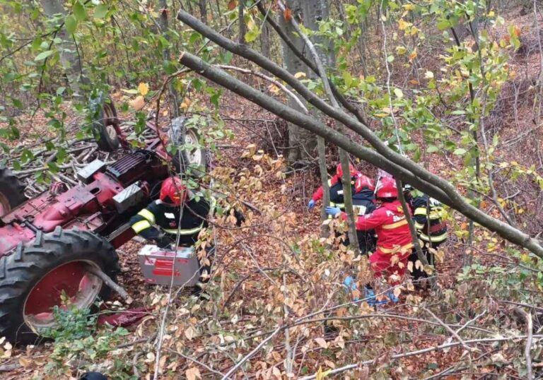 Un tractor cu remorcă ce transporta lemne s-a răsturnat în pădure, într-o zonă greu accesibilă, la o distanță de aproximativ 1,5 km de calea de acces rutieră.