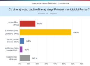 Astfel, față de precedentul sondaj de opinie, Laurențiu Dan Leoreanu (PNL) contabilizează circa patru procente în plus, iar dacă duminica viitoare ar avea loc alegeri locale ar obține 59,3% din voturi. Spre deosebire de acesta, Lucian Micu a pierdut peste trei procente, și nu ar aduna decât 20,2 % din voturi. Candidatul USR, Gabriel – Cosmin Ancuța se situează pe locul al III-lea, cu 5,5% % dintre opțiuni, iar Nadia – Lenuța Moldovanu se află sub marja de eroare, cu 3,3%. Procentul celor care nu au răspuns la această întrebare este relativ mic, de doar 11,7%, ceea ce înseamnă că marea majoritate a romașcanilor și-au format deja o părere despre candidați și au o opțiune clară de vot.